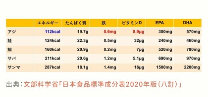 ちなみに...青魚の栄養成分です。たんぱく質·鉄·ビタミンD·EPA·DHA 全部入ってるんですよ。